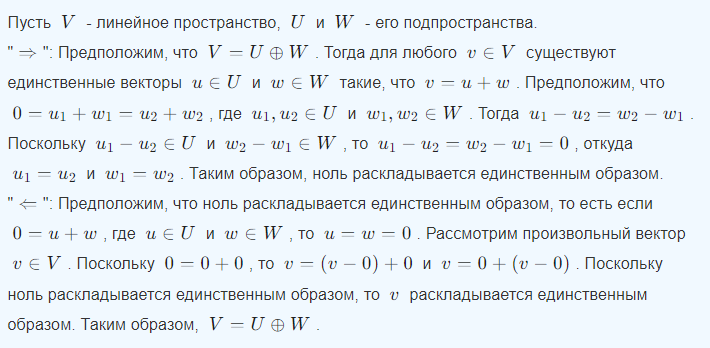 1. Доказать утверждение, что пространство раскладывается в прямую сумму тогда и только тогда, когда ноль раскладывается единственным образом.