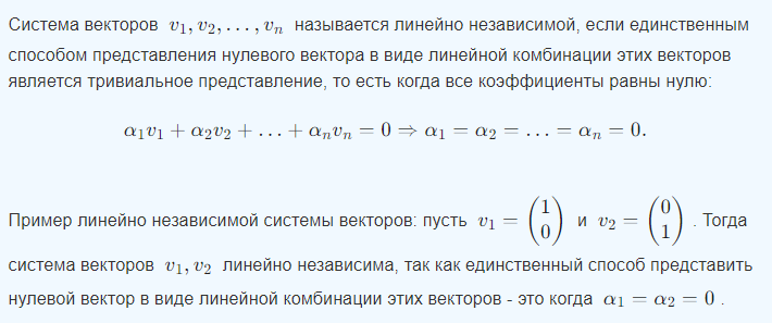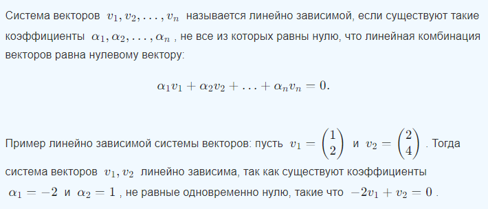 1. Определение линейно зависимой системы векторов, определение линейно независимой системы векторов, привести примеры
