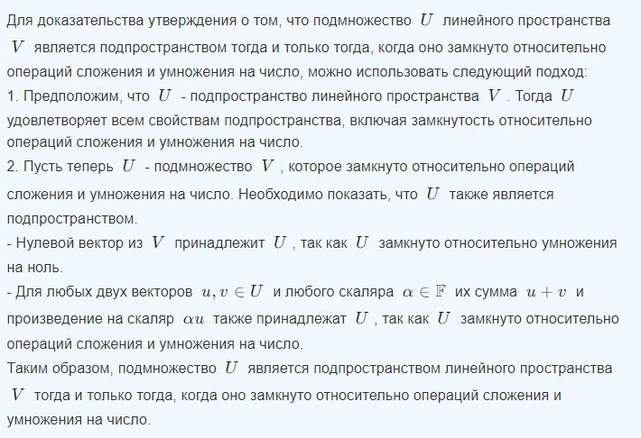 1. Доказательство утверждения, что подмножество является подпространством тогда и только тогда, когда оно замкнуто относительно операций сложения и умножения на число.